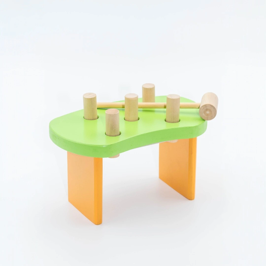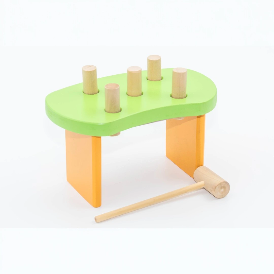 El banquito de descarga de madera es un juego para que los chicos golpeen con el martillo de madera a los palitos de colores, hasta que éstos hagan tope. Al llegar a este punto se da vuelta la tabla y el juego comienza nuevamente. Por otra parte, también se podrán extraer dichos palitos y volver a poner a modo de encastre.