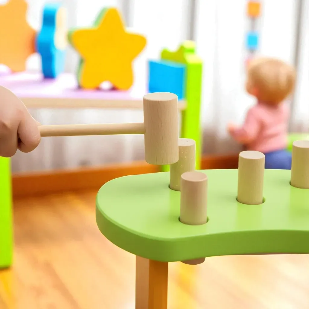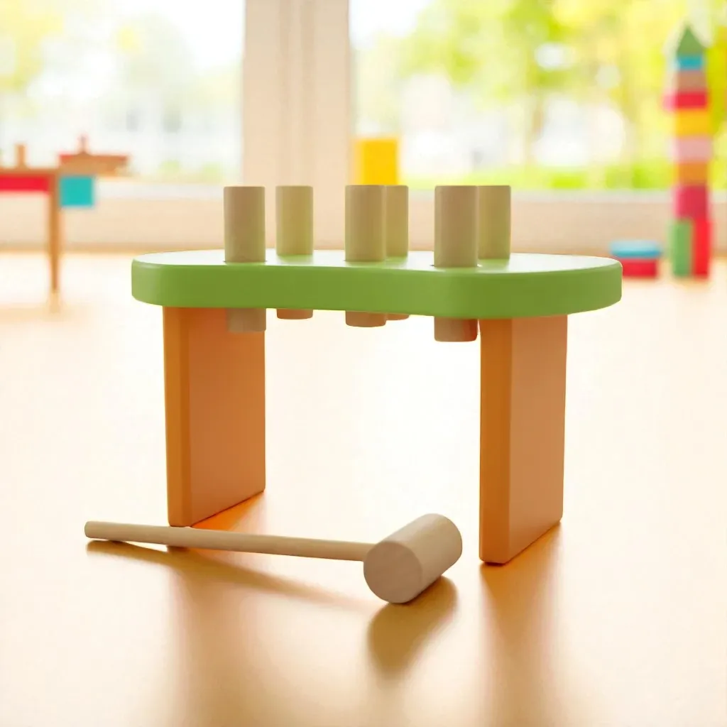 El golpear el martillito de juguete, resulta una actividad adecuada para reducir el estrés y relajar a los más pequeños, además de estimular el desarrollo de la motricidad gruesa. Al usarlo como encastre, también es muy beneficioso para mejorar la motricidad fina.